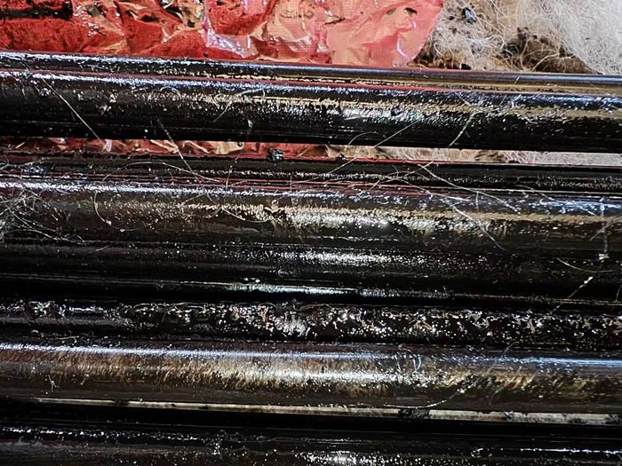 2、根據上圖我們看到導熱油加熱管的表面已經有黑色的油垢,而且有很多雜質在管表面,說明客戶加熱的導熱油比較濃稠,油垢形成比較快,這個油垢覆蓋在導熱油加熱管表面使管表面的熱量傳導不出去,最終燒裂管表面,出現擊穿情況。